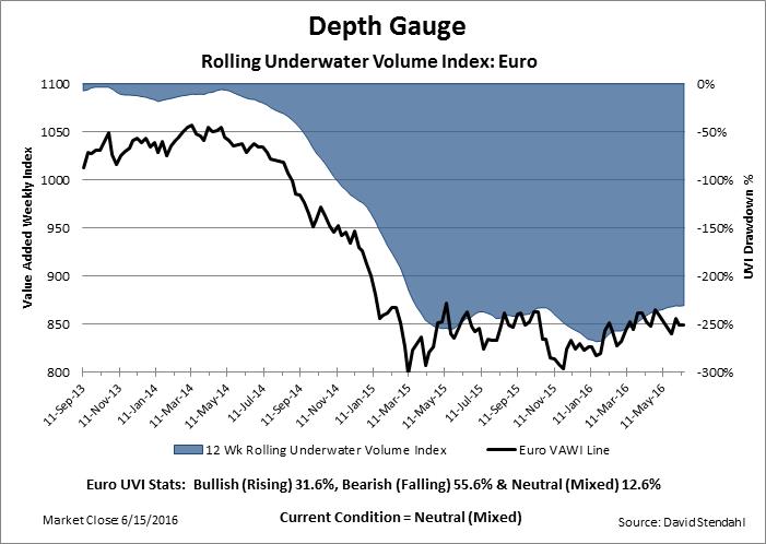 1. Historical Perspective: The direction of the Depth Gauge (i.e. Underwater Volume Index (UVI)) is the key to interpreting this indicator. Is it bullish (rising), bearish (falling) or neutral (mixed)? Three-year UVI stats offer perspective on the general characteristic of the Euro. Answering the question has it been more bullish, bearish or neutral in the recent past. New trends will most certainly emerge in the future, but to do so they will need a spark to change. Knowing the general makeup of the Euro can be helpful until true change occurs.