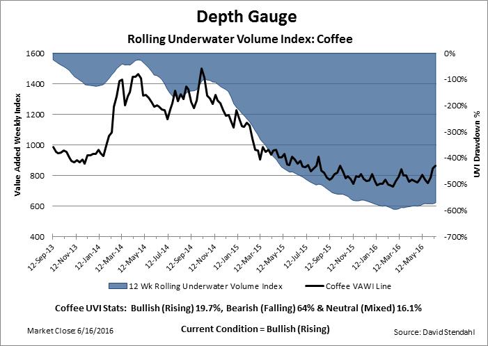 1. Historical Perspective: The direction of the Depth Gauge (i.e. Underwater Volume Index (UVI)) is the key to interpreting this indicator. Is it bullish (rising), bearish (falling) or neutral (mixed)? Three-year UVI stats offer perspective on the general characteristic of Coffee. Answering the question has it been more bullish, bearish or neutral in the recent past. New trends will most certainly emerge in the future, but to do so they will need a spark to change. Knowing the general makeup of Coffee can be helpful until true change occurs.