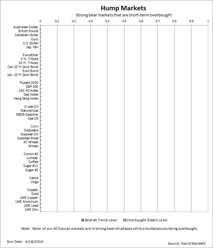 Hump markets are those that have risen to high levels during what is still considered to be a bear phase. Given their recent surge, these markets are at short-term tipping points. If bear trends remain in tact, having these markets in overbought territory makes them sell-on-hump candidates. If however, recent surges help to establish new bull trends then new long candidates are on the horizon down the road. Establishing new longs on these markets now is not recommended as the strength of their trends are still bearish by nature. Take a more wait and see posture. Should these markets continue to rise, look for opportunities to establish long positions. To assist in finding these opportunities, our Dip Market List provides candidate markets that are in established bull trends that have fallen to over sold territory.